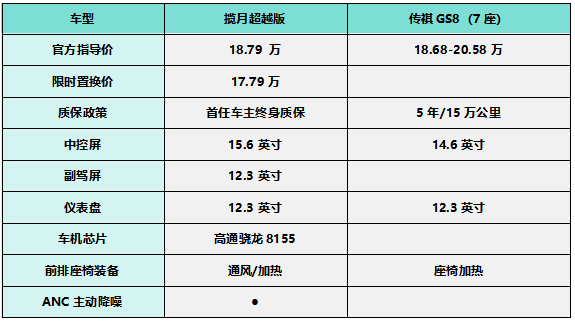 此外,揽月超越版官方指导价18.97万、限时置换价17.79万,传祺GS8官方指导价18.68-20.58万,相较之下,揽月做到了揽月标配即高配,GS8 高配溢价明显。此外,揽月超越版还提供了首任车主终身质保,相较于传祺GS8的5年/15万公里质保政策,后期用车更省心。