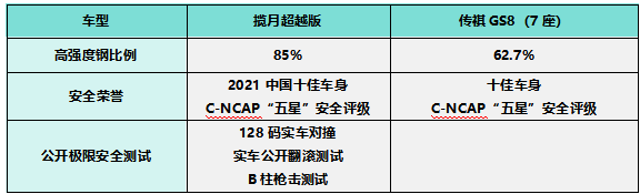 传祺GS8采用五环笼状框架打造,虽然也拥有“十佳车身”的称号,但整车高强度钢使用比例为62.7%,在安全用料上与揽月存在客观差距,被动安全表现更为常规,同时无公开极限安全测试,相较之下,揽月超越版拥有更令人信服的安全实力。
