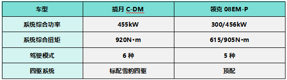 揽月C-DM搭载雪豹四驱系统,系统综合功率455kW、综合扭矩920N·m,日常通勤代步等待红绿灯起步快人一步,高速超车也更轻松,周末去山林露营、泡温泉,整车满员的同时行李箱塞满的高载荷场景,爬坡上坎也不是问题。领克08EM-P提供了两种版本,其中单电机版本最大功率300kW、最大扭矩615N·m,双电机版本系统综合功率456kW、系统综合最大扭矩905N·m,但双电机四驱版仅限于顶配款。